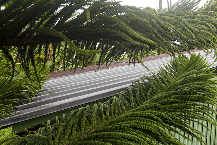Norfolk pine, old and new roofing on the falling-down shed. It's a rainy day with dull light. I grabbed the superwide and went out back to the old shed. Last night I was thinking that the long, graceful pine branches might look good against the roofing, so that's where I headed when the rain slacked. I had been hoping that the piece of 3/8" rebar that I put on the gray roofing iron (because I couldn't think where else to put it) might show up. But I couldn't get the camera high enough and didn't want to go get a ladder, because it was starting to rain harder.