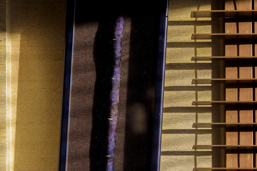 Inside. (I never promised to shoot only outside, did I?) Morning sun, blinds, and a Chinese blue pheasant feather lei that belonged to my father, in a frame knocked askew by the storm winds. That makes a good story, anyway. More likely one of us knocked it with an elbow while securing the windows. And the glass is dirty. So are the blinds and so is the paneling. Time for some cleanup, but not just yet.