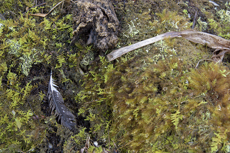 I was out on the street side of the house, a place where I rarely shoot. Maybe never, actually. I found a HDI-worthy few things but, as usual, they were vegetation. Then I found a mynah feather, so that's what you get. Animal image! And stump. Dead ti leaf, moss, ferns, dew, and all the others. But at least you get an animal part.