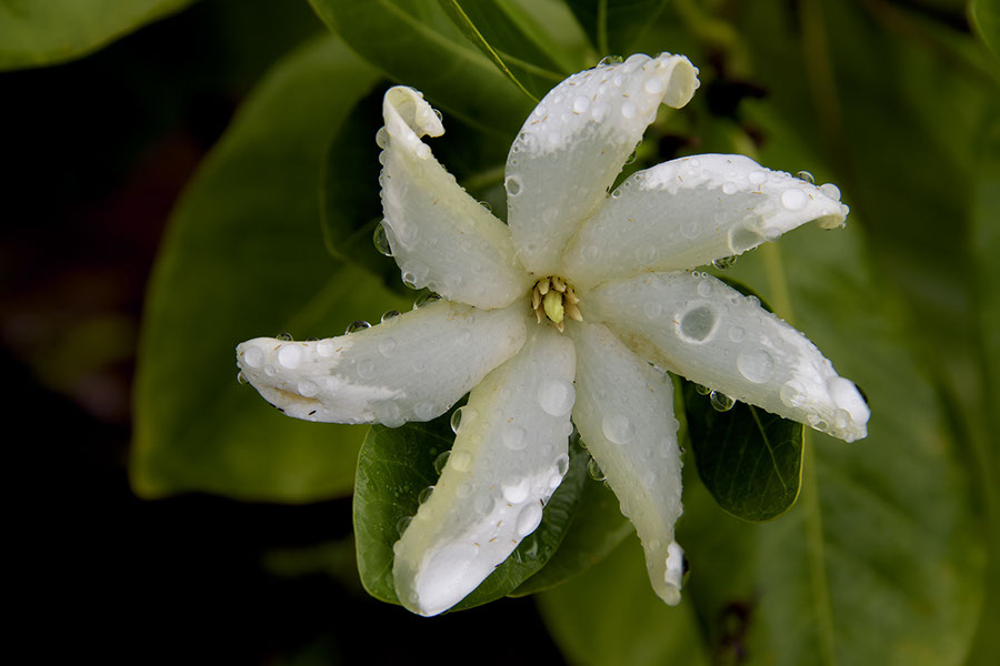 This is a depigmenting Tahitian gardenia. I noticed it because of the unusual combination of whiteness and translucency. I don't know what that's all about, but when I saw it I mounted the lens that can make closeups.
