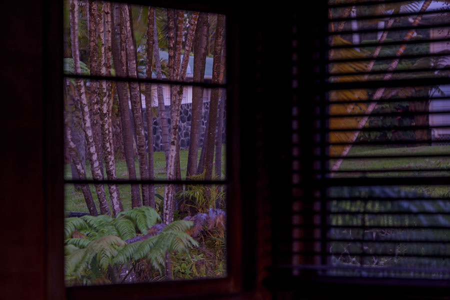 There was a particularly beautiful sunrise. After I came in from shooting it -- wondering if I'd risk boring viewers with Yet Another Hilo Sunrise -- I put down the tripod to close the door, and when I turned back to it there on the screen was this. It's my clump of Areca palms, and the houses across the street, out the corner windows. I thought it was more interesting than YAHS, but you can decide.