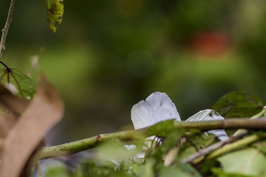 Just as with the kukui leaf shot from August 15th, a frontal view of a hibiscus flower was pretty, but uninteresting. From the back, in sharp focus with narrow depth-of-field -- much better. So that's what you get.