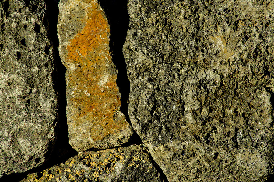 I set up at 400 mm because I thought the roof and solar panels would show some interesting shapes and patterns. But when I got down to work, I saw nothing interesting there. I shot the pressure washer and its shadow against the house, which was mildly amusing because of the flattening, but not HDI-worthy. I was near one of the walls, and the stone's color caught my eye. I didn't need a long tele to make this shot, but that's what I had mounted, so I used it.