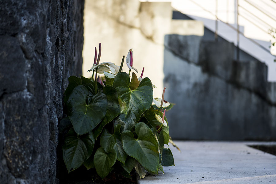 Usually people are looking down at anthuriums. This morning as I was headed out into the yard to see what I could find, I looked back up the steps and there was a different anthurium view. A little messing with depth of focus and that was that. Yesterday's image was from the steps in the background.