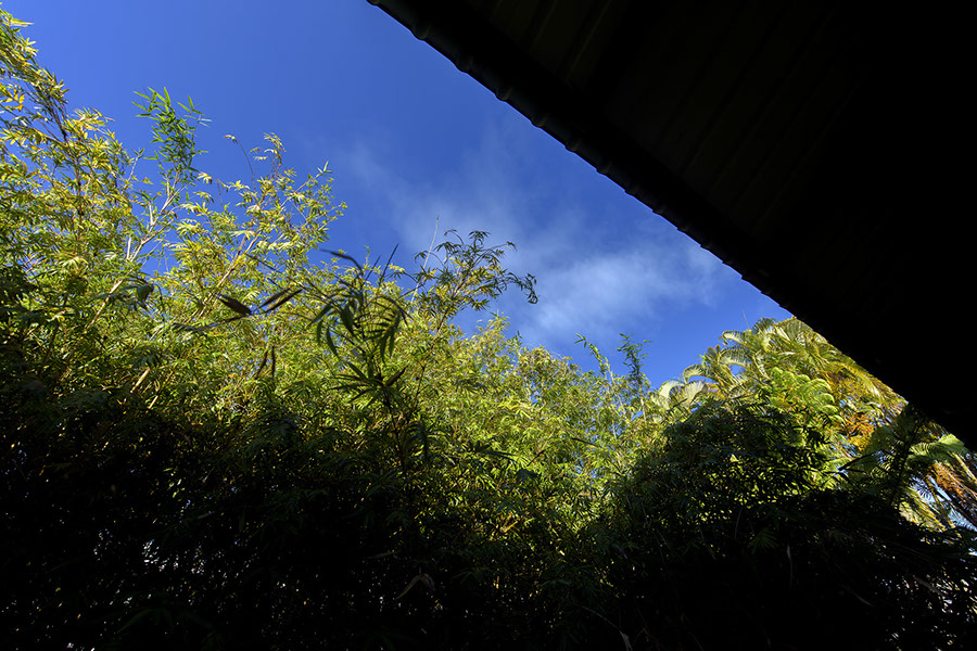 Bamboo, Areca, roof, sky. And a heavy hand on Lightroom's Black slider.