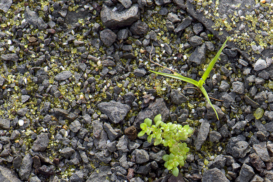 The olivines are making up what's called "green sand," and I found a few glass bottles of green sand around the house. I'm sure it came from the famous "Green Sand Beach" down at Ka Lae (South Point). My parents must have grabbed some of it a long time ago. In the old days, almost nobody knew about or went to the Green Sand Beach, not that that's an excuse. These days, it's crowded.