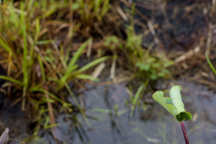 One of Ruth's poems ("Sometimes in Dreams You See Wings") came into my head, because one of its lines includes "like a leaf unfolding, or a wing." Today I offer you a taro leaf unfolding. With an insect on it. In standing water that's probably breeding mosquitoes.