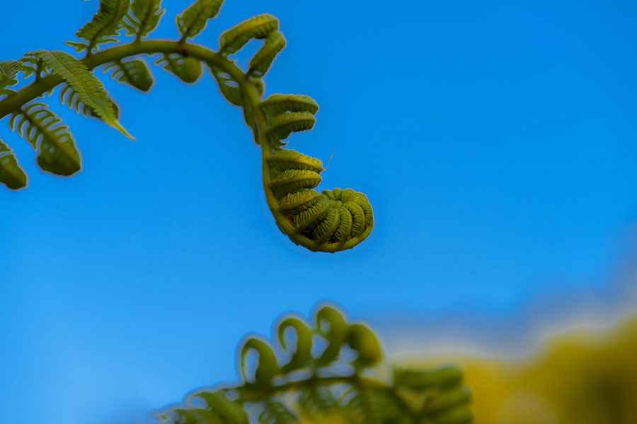 Yesterday I was taking the dead and dying fronds from the hapu'u along the side of the house. This needs doing every month or so, although the green-yellow-brown fronds do make nice color combinations. I saw there was a frond opening, so this morning I went out to see what I could do with it.