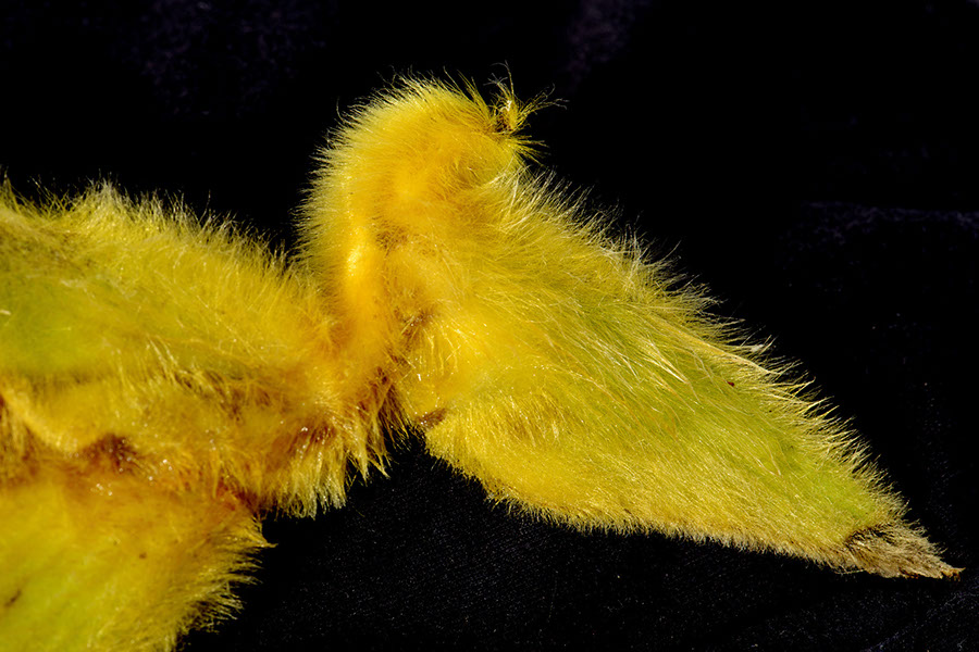 Back to the hairy yellow Heliconia. Bill broke off part of the flower and I brought it back here. Technically, today's HDI was made in the yard because the object was physically present here. I suppose that's splitting hairs, but it's my site and I'll split hairs if I want to. How could I not image this beauty? Even at the nursery, even in late afternoon without much light, I knew do this end. It seemed pelican-like to me, except for the canary yellow and the hairs. But you know what I mean.