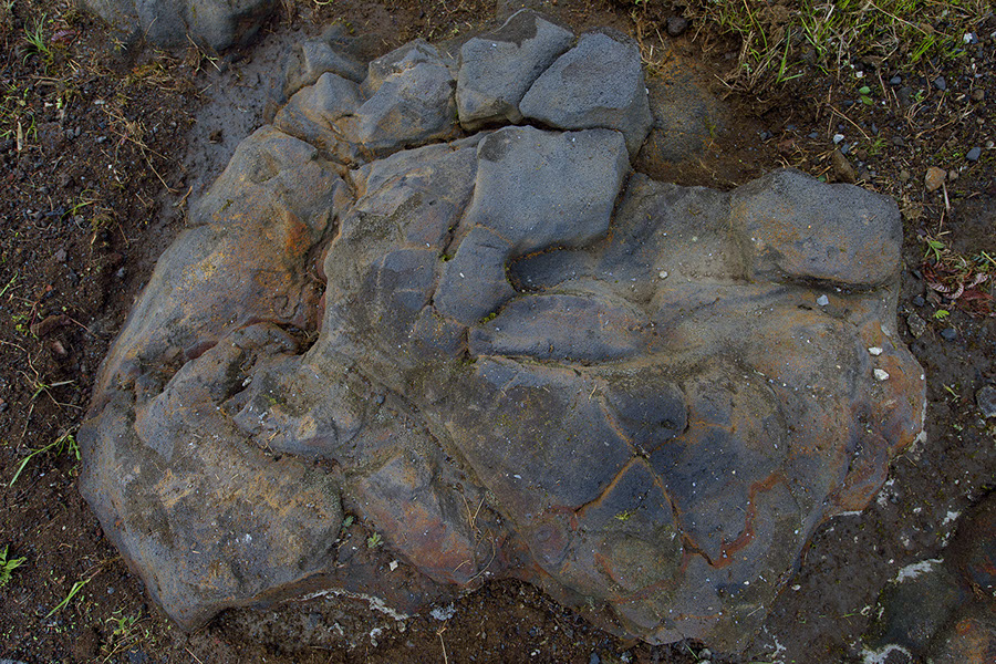 Lava. Most of the yard is underlain by a lava flow (probably just one). This outcropping was near the surface, and a few years ago I exposed it with a shovel and a pressure washer. Then dust and dirt and cinders partly covered it again, so I got to work with the washer a couple of days ago and cleaned it up.