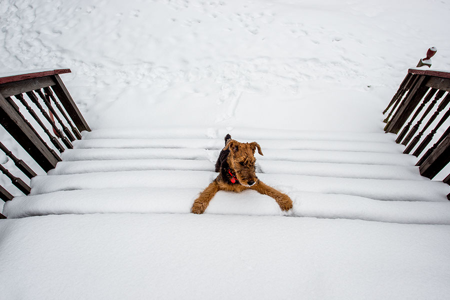 This is one of my favorite Radar pictures. It was the Colden Daily Image for March 2nd, 2013. He couldn't make it up the stairs from the yard. I always mentally captioned this shot as "If I'd just taken a better run at it."