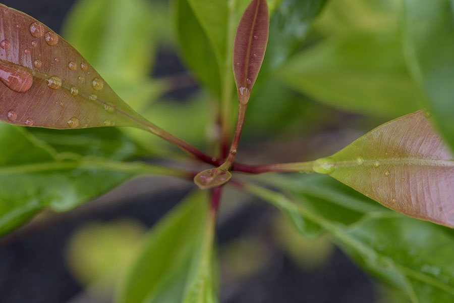 This morning I thought the clove leaves had fine HDI-worthy color gradations. I shot a few against the sky, but (sorry) those shots were boring. Leaves against contrasting background again, woo hoo. So I tried to look differently at the little tree (6' or so tall). I saw that I could get positioned looking straight down a branch, focusing on the top leaves and letting the others radiate as they would. I used a variety of apertures and this one was the best compromise between having the distant leaves and stems completely out of focus, and having them more or less in focus. I really didn't like the in focus shots.