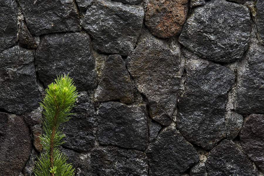 Black pine, rock wall, wetness. We have two black pines in the Zen garden. One is bonsai and the other (this one) isn't.