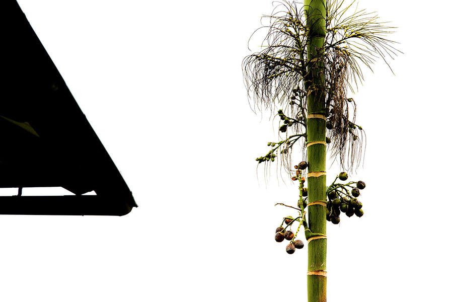 Betel palm (Areca catechu), betel nuts, roof, and gutters. The sky wasn't quite as white as I've made it, but nearly so. I'm fond of chewing betel (which the Nagovisi people of Bougainville taught me to do) but it's hard to find lime and betel peppers in Hilo, so I don't chew much.