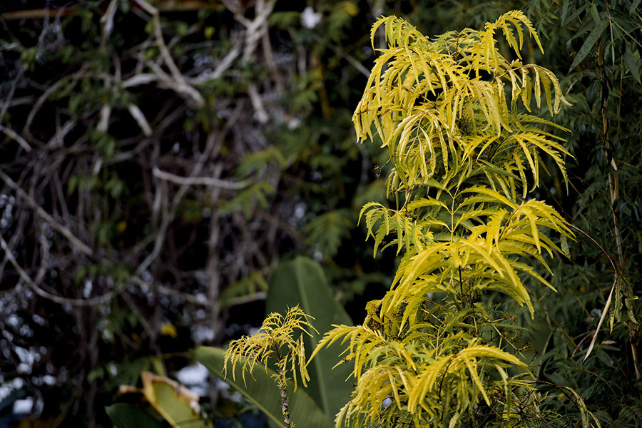 I'm not sure what this yellow-leafed plant is, but under the right lighting conditions it stands out.