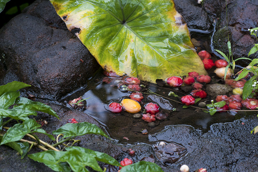 Taro leaf, kumquat, Surinam cherries, some weeds, an aggressive creeping vine, and of course lava. And water.