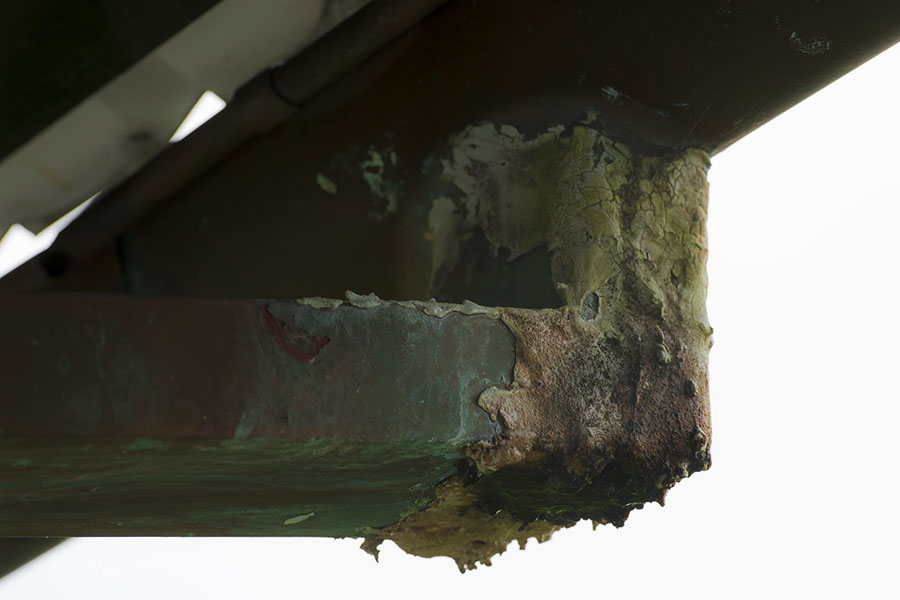 Time for an inanimate object on a rainy day with a colorless sky. I don't know who made this downspout repair, or when, or with what. It might have been my father -- it looks old enough for that (he died in 1989). It doesn't leak too badly, so I'm not going to worry about it for a while.