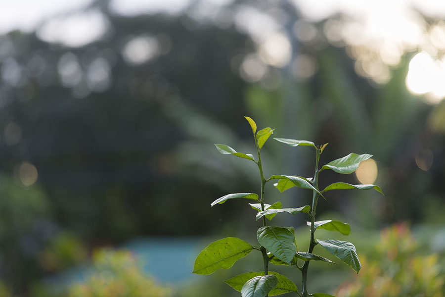 The Meyer lemon in the Zen garden, flanked by two clove trees. With aphids and spiderwebs. And no, I didn't compose the shot to place that yellowish blob between the leaves.