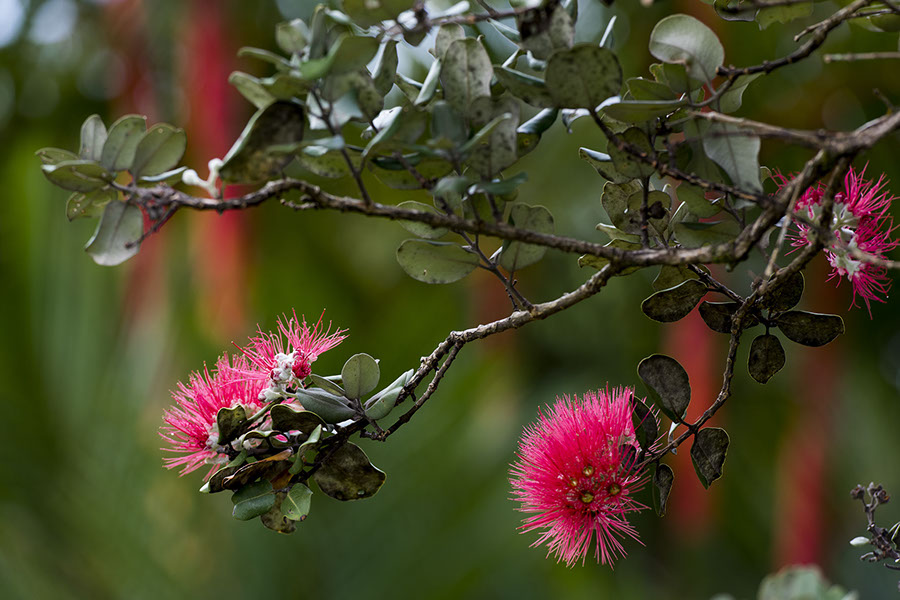Red 'ohi'a lehua, with the Walsh's "lipstick" palms in the background. I though the two reds would be interesting. We planted this 'ohi'a in 2008. It's in the back, so we don't get to admire it much.