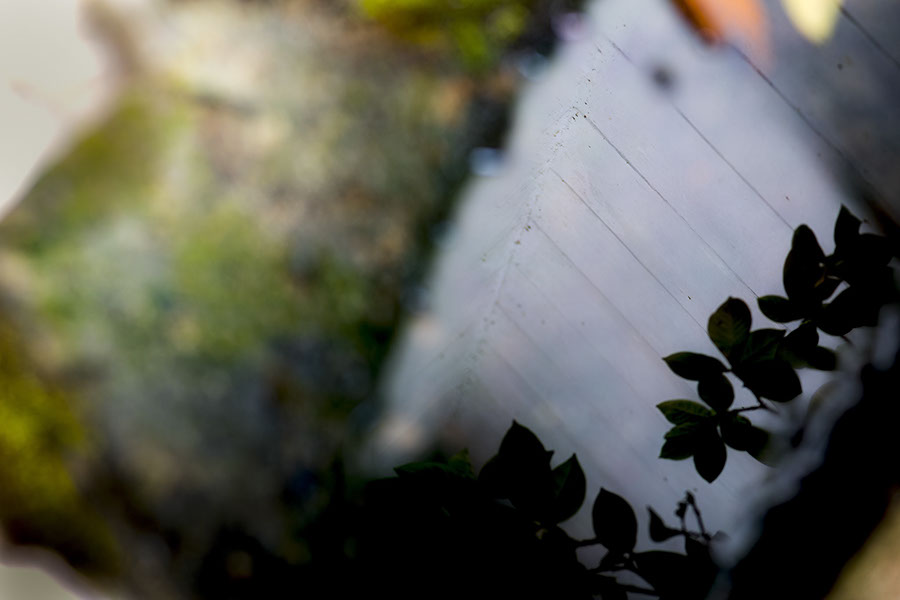 Corner of the house, reflected in the drainage basin (which, thanks to the rain, has water in it). Gardenia leaves, also reflected.