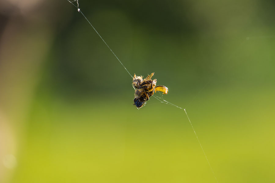 One of Tom's Hawaiian (native) bees, caught and sucked dry by this invasive spider. A native spiderweb would have caught the bee too, and a native spider would have sucked it dry too, but I'm unhappy that it was an invasive's web.