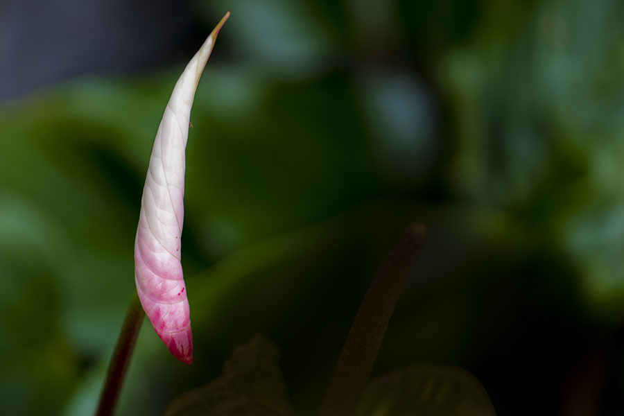 Anthurium unfurling, from the side. Notice the red ant, which seems too big to be a Little Fire Ant. I hope. I confess to using some Photoshop tricks to damp down the foreground. I could have cropped it in portrait mode, I guess.