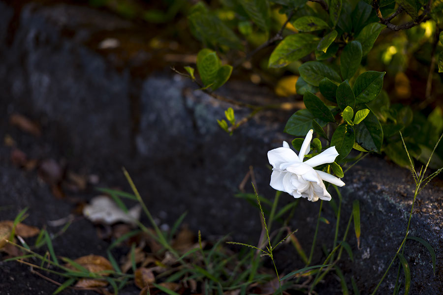 Not every gardenia sits proudly high in the bush. This one is falling down over the driveway's curb, joined by stray grasses and dead leaves. Somebody needs to pressure-wash the driveway again.