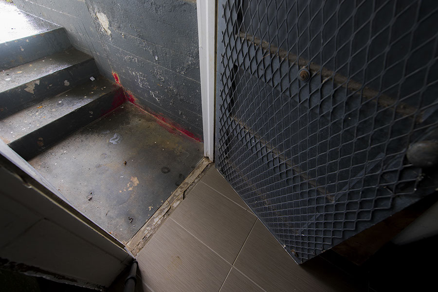Steps down to ground level, RedGard, door, tile, tripod leg, troubled concrete paint, dryer lint, dead worm, dead cockroach. What's not to like?