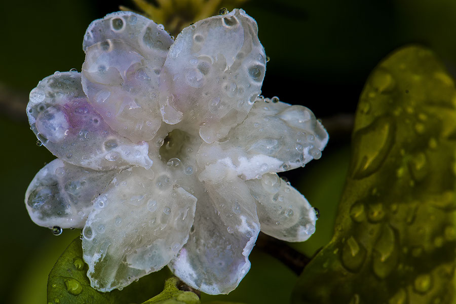 Translucent pikake blossom. It fell off after I finished shooting it, which I think means that translucency was its last phase. I saw this with a gardenia a few months ago.