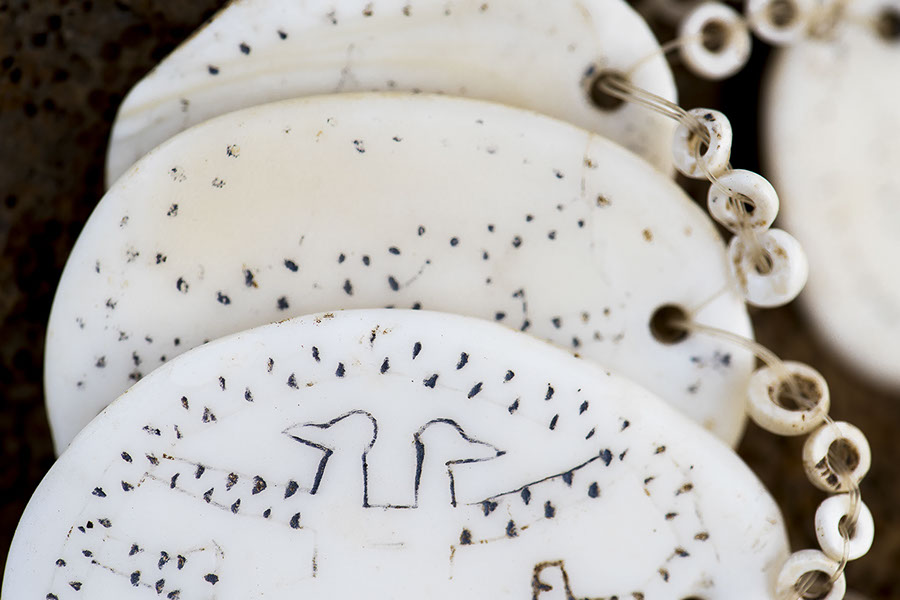 I asked about the black substance in the scribings, thinking it was something like charcoal mixed with a binder. Answer: shoe polish. Explanation: it's easier. I asked why the necklace wasn't strung with fiber. Answer: fishing line doesn't break.