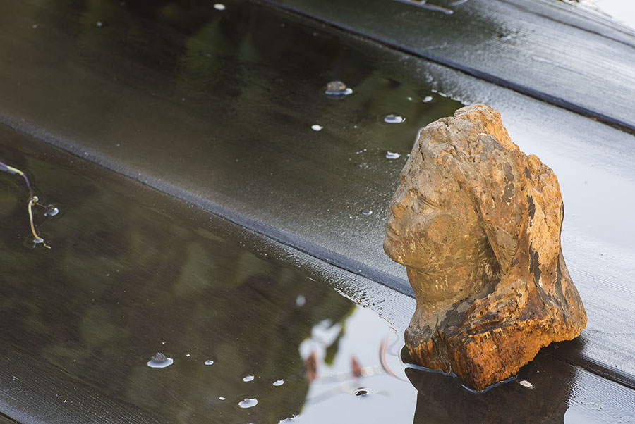 Italian, perhaps an "ecstatic Madonna" (I've been told there is such a tradition). Perhaps very old, perhaps not. Certainly very dry, and I allowed it to soak up rainwater, for the effect. I don't think that will damage it.