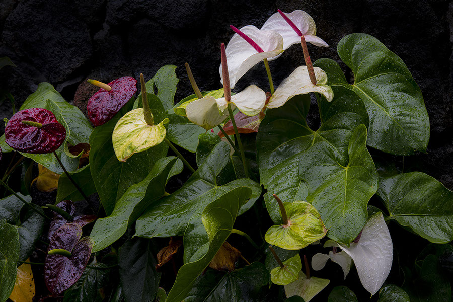 Rainy and dark -- perfect for anthurium against the black lava wall.