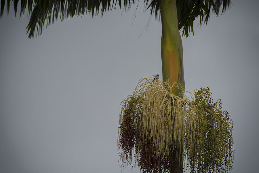 But when I went out on the porch about 6:30, I noticed the orange splash on the Areca. I usually think of the Areca as a tree that's in the way of what I'd like to shoot. But today it looked quite nice, even against a dull sky. So I set up the 400 mm and got a bird as a bonus. That's a yellow-billed cardinal (from South America; obviously invasive).