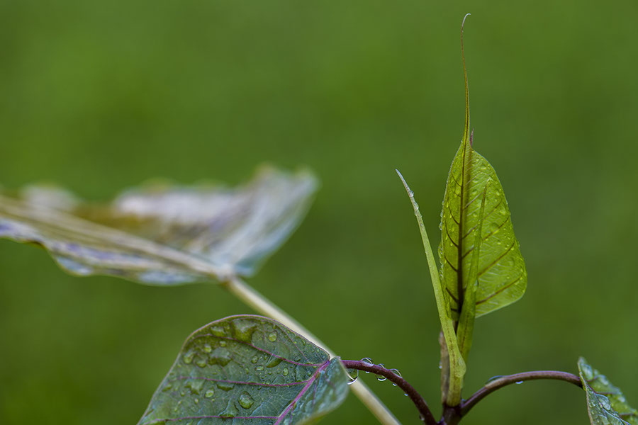 This one has three (count them, three!) new shoots that I assume will take on leaf shape soon, and a nice range of colors. I'm not crazy about green on green. I keep meaning to experiment with taking something like a length of black or dark blue cloth, and dropping it on the grass (for shots like this). I never promised not to interfere with what the yard gives me, although I've done it very rarely. If the rain stops soon, I might go out and see what it does to the same setup.