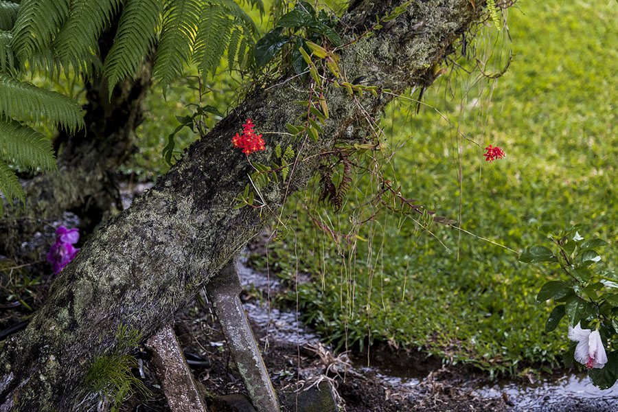 Here's what I found from the front porch not long after 6 AM. I don't think I've ever put hibiscus and orchids in the same frame, so here they are. With rain and running water and not much sun.