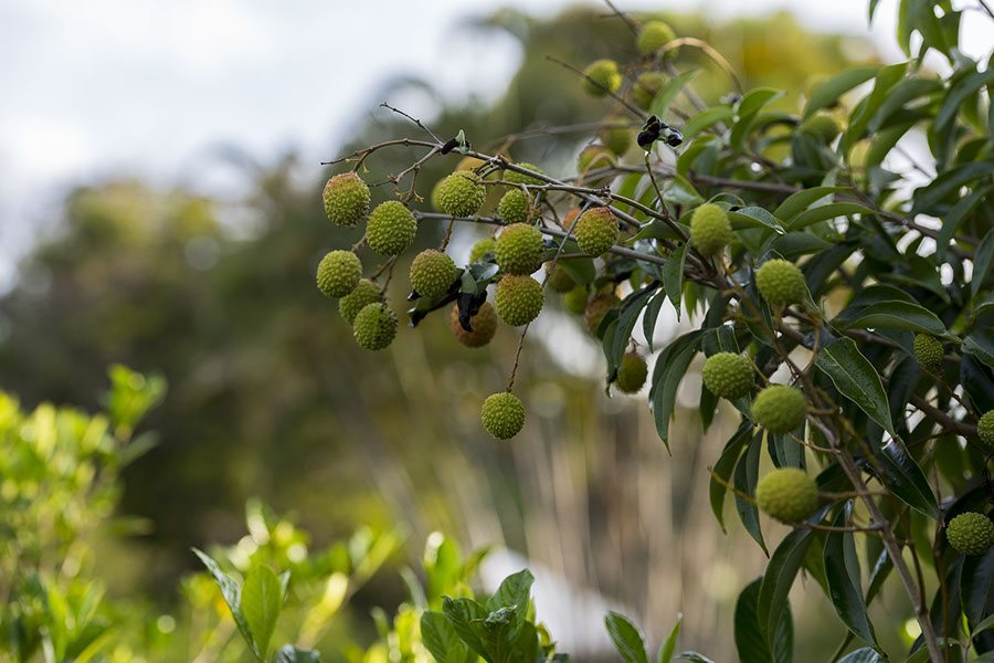 Lychee (ripening very nicely), gardenia, Dypsis, sky. Neighbor's roof.