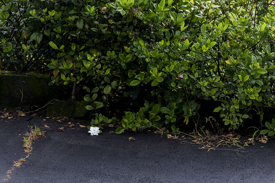 There's a branch of one of the gardenias droops down to touch the driveway, and doesn't seem to care. It blooms anyway. Sometimes, like this morning, that part of the driveway is in shadow, and any white gardenia there pops out.