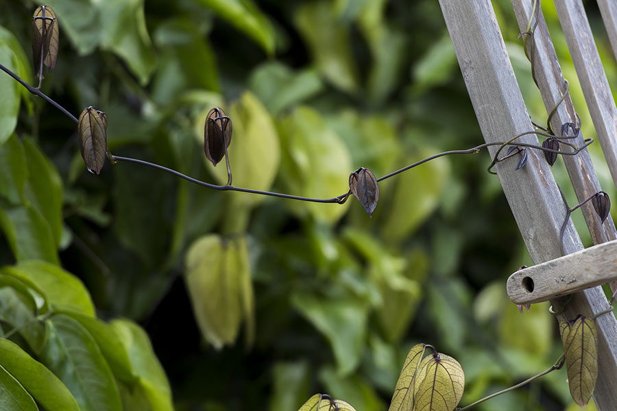 Blue jade on the attack. It's amazingly aggressive -- anything within 3 or 4 feet of the main growth is vulnerable. It's after the chairs, the kukui, the coffee, and the clove trees. On the positive side, it's put out two new sprays of blossoms on the zen garden side. I have to cut it all back, which I'm going to hate doing, because it's such a strong, vibrant vine. But by now -- about a year after we planted it -- there's just too much of it.