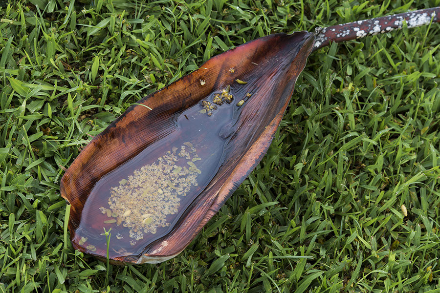 It rained overnight. This is a Dypsis frond (from the back corner Dypsis, of course) with Surinam cherry blossoms in it. How they got there and how they stayed there during the rain is mysterious to me. Maybe I'll go back out later today and see whether I can understand how it happened. The Surinam cherries are a good 20' away.