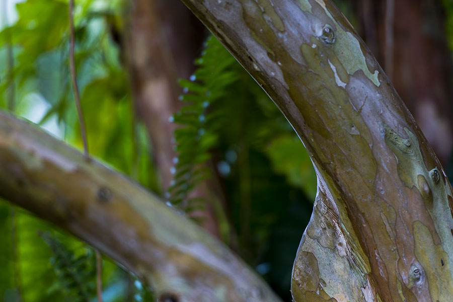 I was out there looking at the Dypsis, where there were interesting shadows. But when I turned away, I noticed how a portion of the guava stood out against the shadowy background, with the trunk almost seeming to be lined with white.