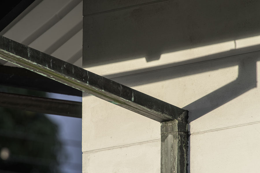 It should be clear what this is. To the upper left, though, we're seeing the underside of the metal roof quite a distance away. And the gutter (which you can see suspended below the black purling) appears to be aligned in a way that it really isn't. In other words, it's really at right angles to the wall, but because it's all pulled together it seems to almost be parallel.