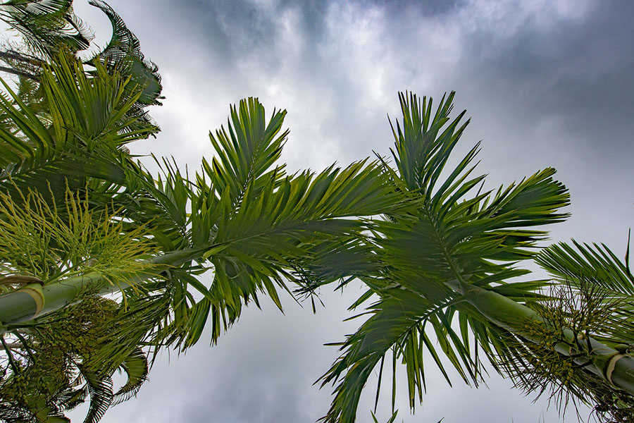 I thought I might find something interesting at the base of these two betel palms, so I got down on the ground with the beanbag. Nope. Boring. So I looked up. Way less boring!
