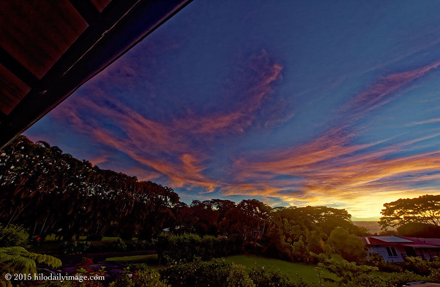 It's rare for the sunrise to light up the sky to the north (left of the picture) but this morning, it did. Typically if I want to do a sunrise I use a telephoto, and try to isolate what I see that's interesting. But this morning it was still Superwide Week. I stayed on the porch, using a framing I've used before.