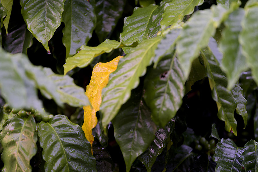 I went out into the driveway with the 300, and found some nice light on the coffee tree's single dying leaf (it's a healthy tree!).