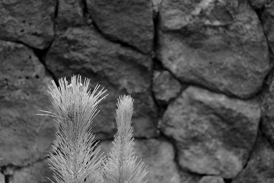 This is a black pine that's in a corner near the rock wall. The needles at the top are always a lighter color, and the contrast is attractive to my eye. But when I shoot it in color (as I have, many times) the contrast and colors are never very interesting.