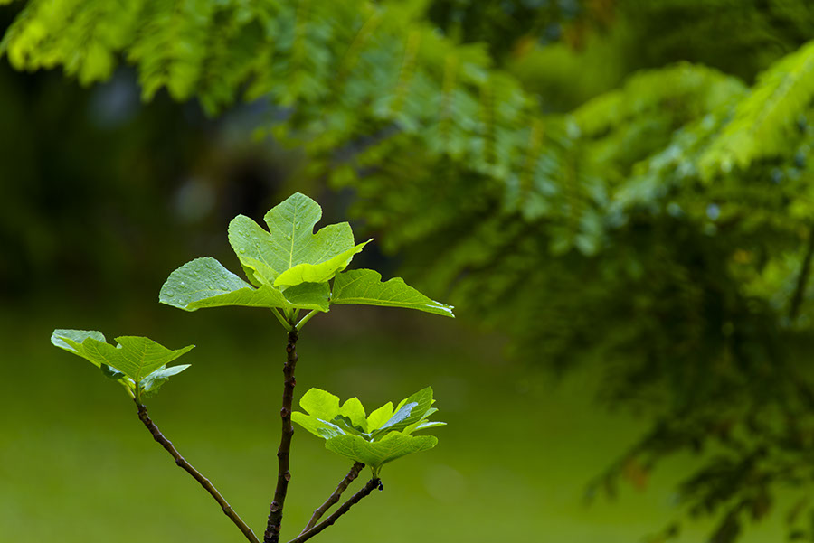 Fig tree. The greens caught my eye. This is the fig tree that for months was growing at a stick with a few leaves -- no branches. Now it's changed its mind and is going for branches, which is good.