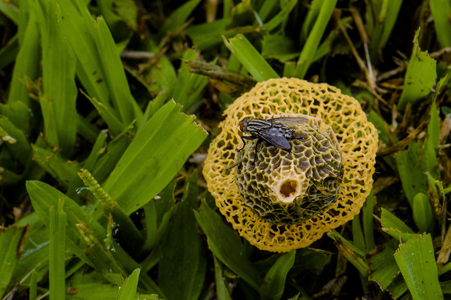 I got back from running and stepped into the yard to see how the Bodhi tree was doing -- and saw this fungus (and fly). I went inside and got the equipment and made a few images. But because I had no idea what it was, I posted this image (and this one) on the Hawaii Conservation Facebook page. I wasn't surprised to have an answer within five minutes. This is Phallus indusiatis (if you check the ancillary image you'll understand the genus name).