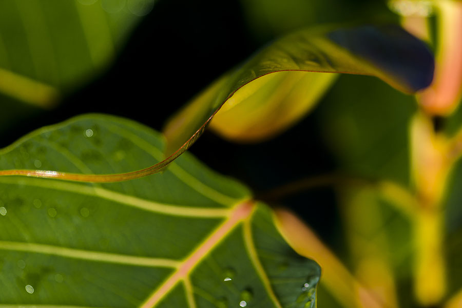 What I saw this morning was the leaf's under surface nicely illuminated. I thought that if I focused on the edge, then the under surface would go increasingly out of focus and that might make for some nice color graduation. I thought that the focus effects would be ruined if I got in too close, so this is a severe crop.
