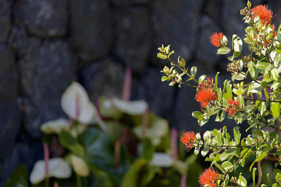 When I turned away from the gardenia bush, still in the driveway, I saw the orange 'ohi'a exploding with color and, for the first time, was in a position to have the anthurium bed and the wall in the background. I don't know why I never noticed the conjunction, but I didn't.