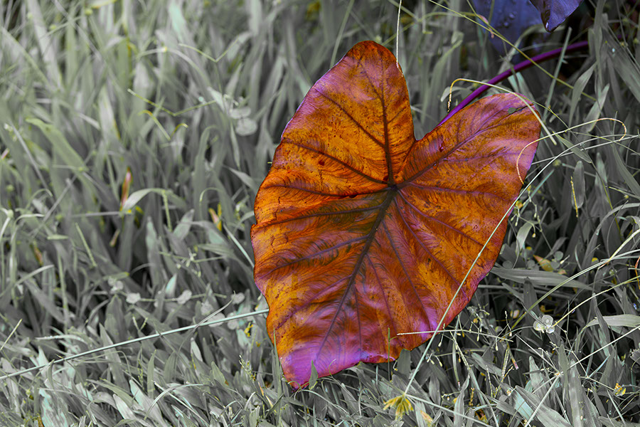 Taro leaf. Its color is about right, with the purple tones being reflected from nearby purple taro leaves.